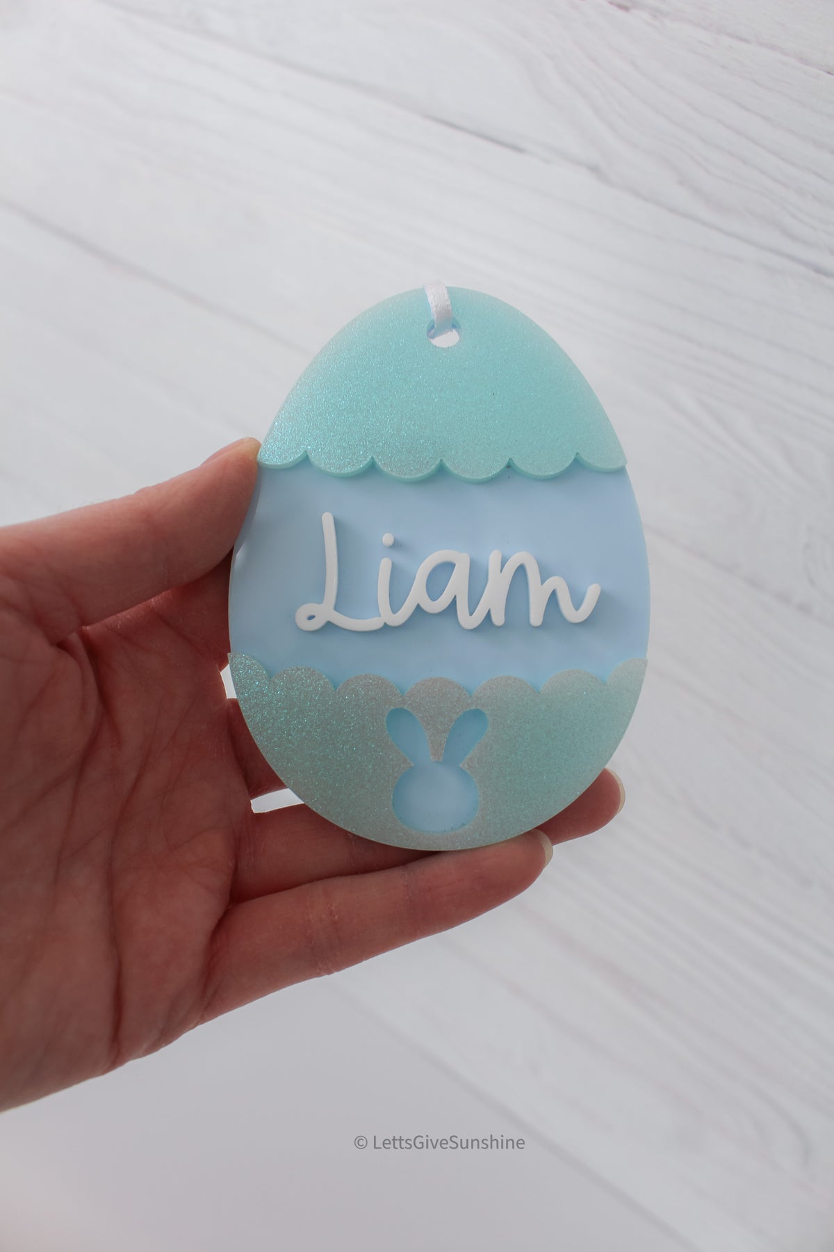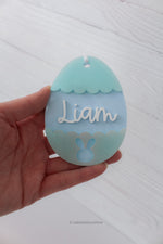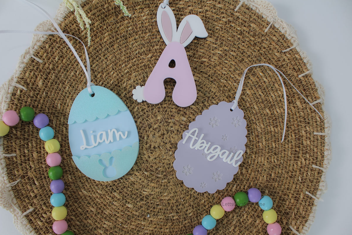 This layered acrylic Easter egg tag features soft pastel tones, subtle shimmer scallop details, and your choice of name in raised script. Finished with a sweet bunny silhouette at the bottom, it’s the perfect finishing touch for Easter baskets, spring gifts, and Easter morning photos.