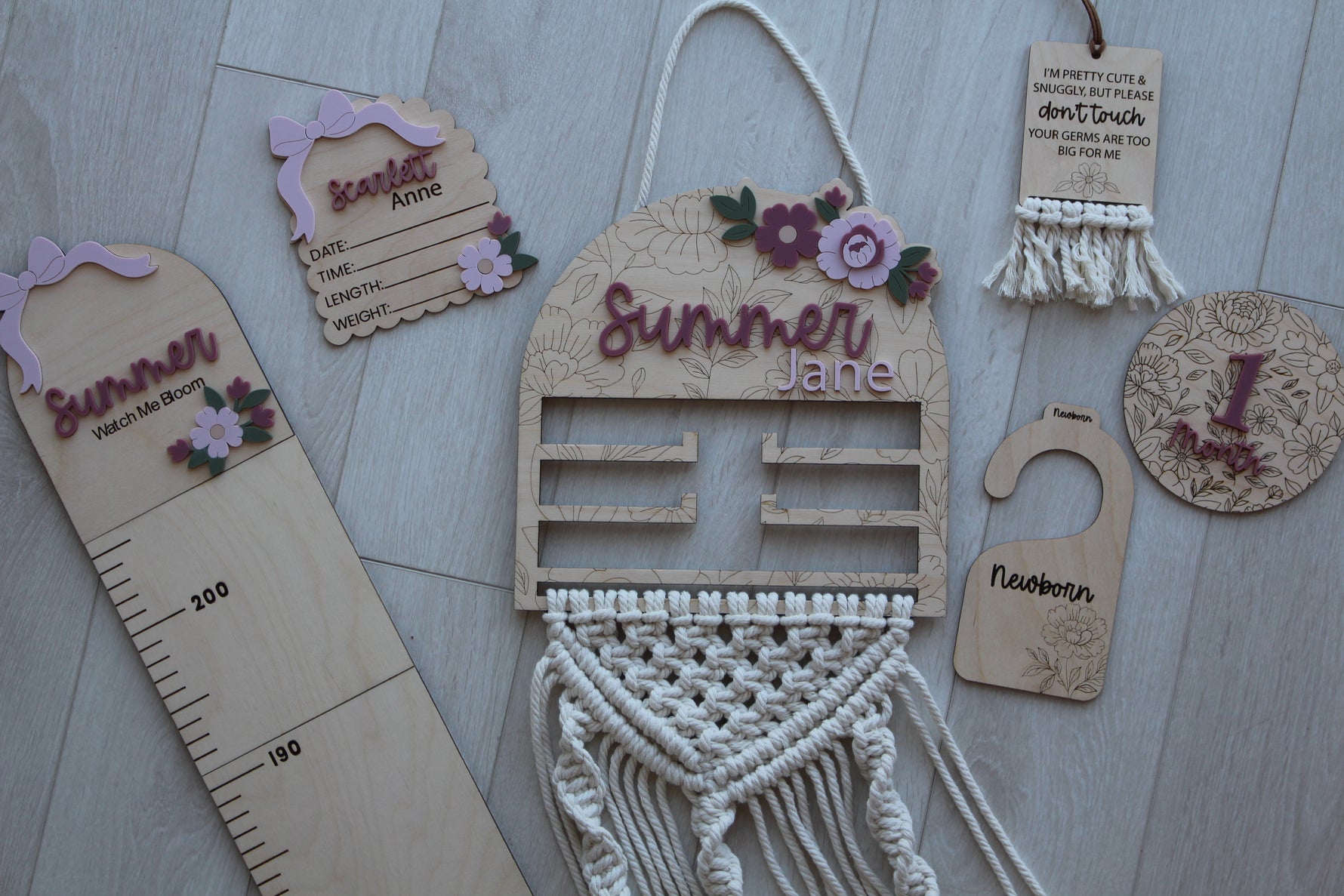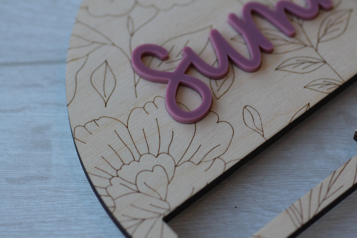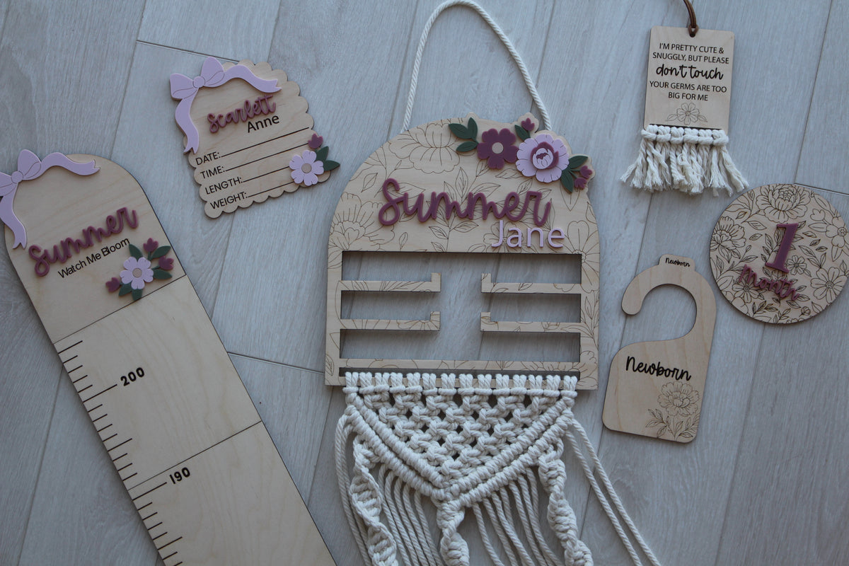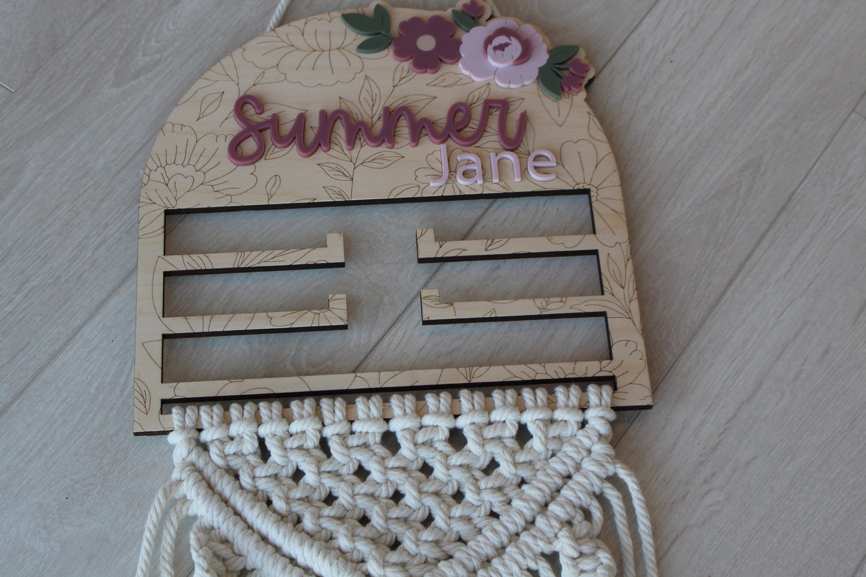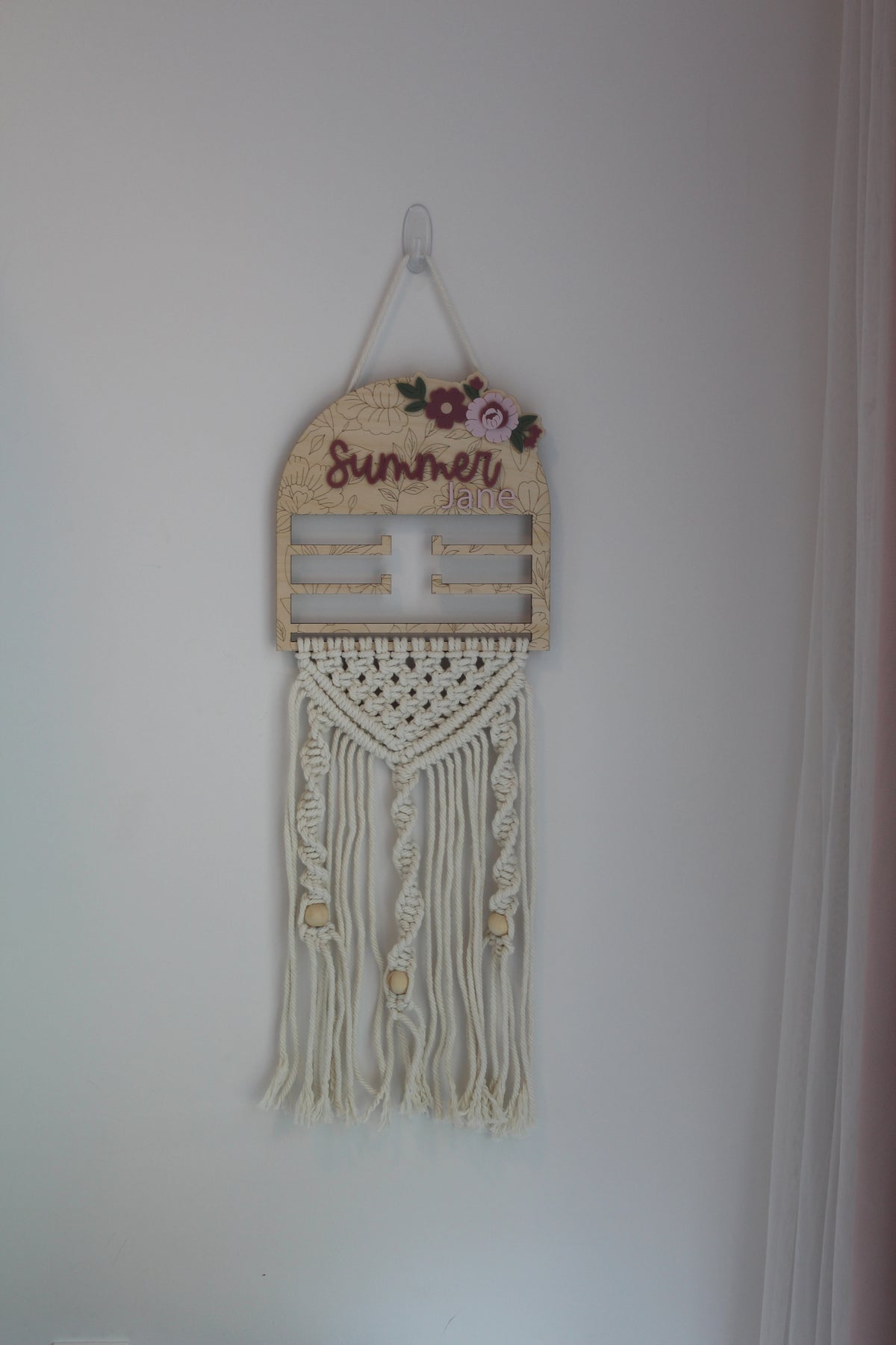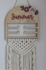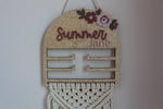 Keep your little one's bows, scrunchies, and clips beautifully displayed and easy to find! Each holder is handmade and hand-tied with macrame cord. The wooden top featured your choice of name and delicate floral details.