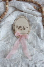 This personalized baby name announcement plaque is designed to celebrate one of life’s sweetest moments. Featuring a soft plaid border and finished with a delicate chiffon bow, this wooden plaque photographs beautifully and adds a timeless touch to newborn photos and nursery décor.