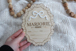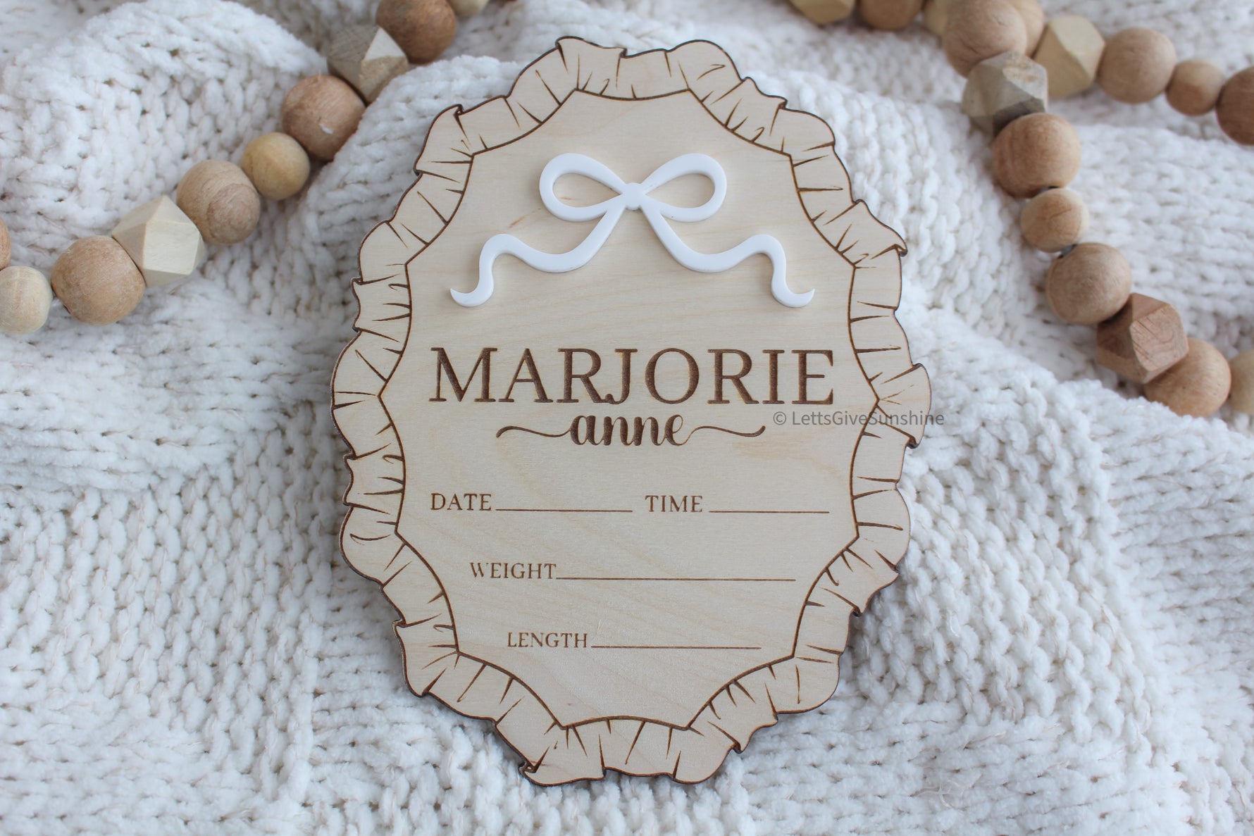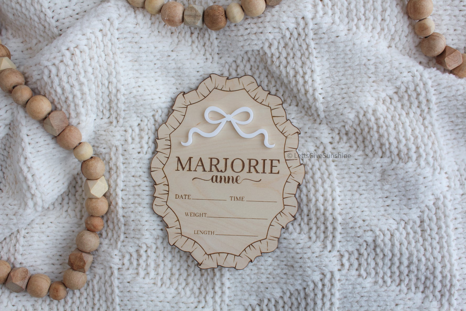 This personalized newborn stat plaque features a delicate croquette ruffle edge and a soft bow detail, creating a timeless heirloom look that feels both classic and sentimental. Custom engraved with your baby’s name, this piece is perfect for capturing those first photos and displaying in the nursery long after.